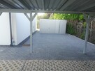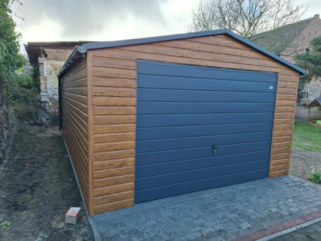 Konstrukcja garażu wykonana jest z kątowników ocynkowanych. Poszycie wykonane jest z blachy trapezowej w kolorze ral 6020 ...